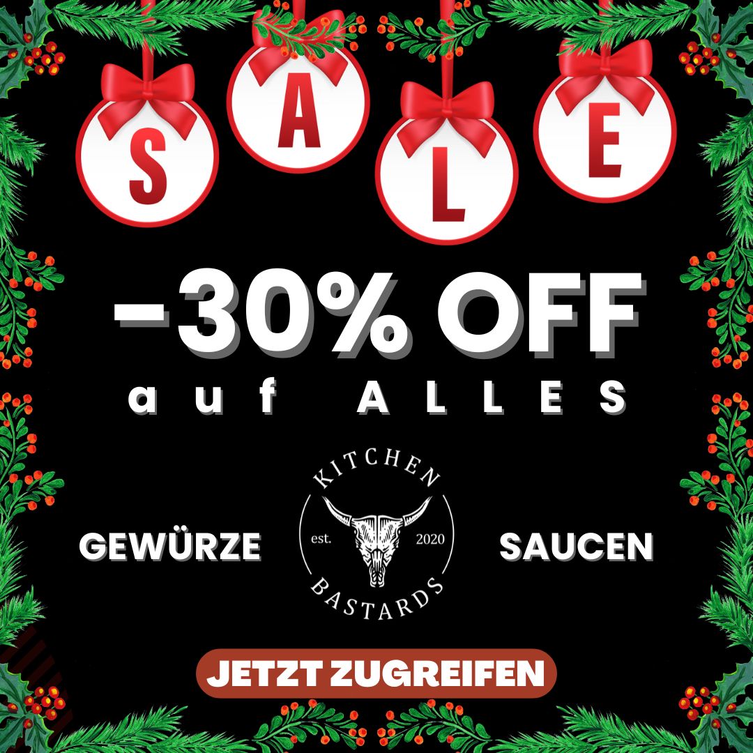 Ho-ho-holt euch den Christmas Sale! Alles – ja, wirklich ALLES – -30%: Gewürze, Saucen, Bundles, Kleidung. Greift zu, bevor der Weihnachtsmann merkt, dass wir durchdrehen!“